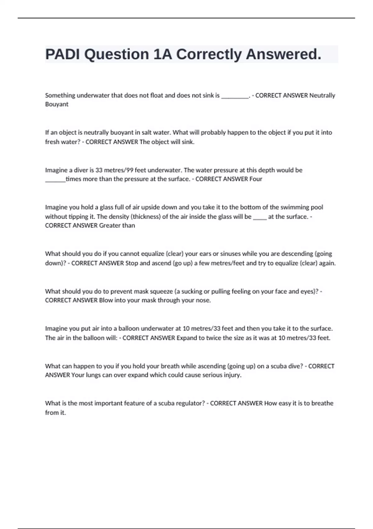PADI Physiology Practice Review Test. Exam (elaborations) PADI IDC Complete Study Guide Test. Exam (elaborations) PADI Rescue Diver Complete Study Guide Test. Exam (elaborations) PADI Deep Diving Practice Study Guide Test. Exam (elaborations) PADI Enriched Air Diver Complete Study Guide. Exam (elaborations) PADI Certification Exam Correct