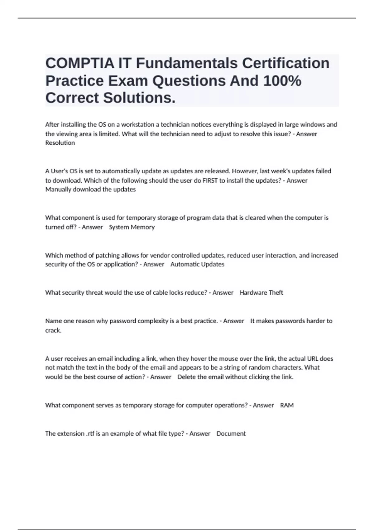 1 Exam (elaborations) ________________________________________ IT Fundamentals,TestOut IT Latest Exam Questions With All Correct Answers. 2 Exam (elaborations) IT Fundamentals, Module 1, Unit 1-2 Pro Test Questions And Correct Answers. 3 Exam (elaborations) IT Fundamentals Prep Exam Questions And 100% Correct Answers. 4 Exam (elaborations) IT Fu