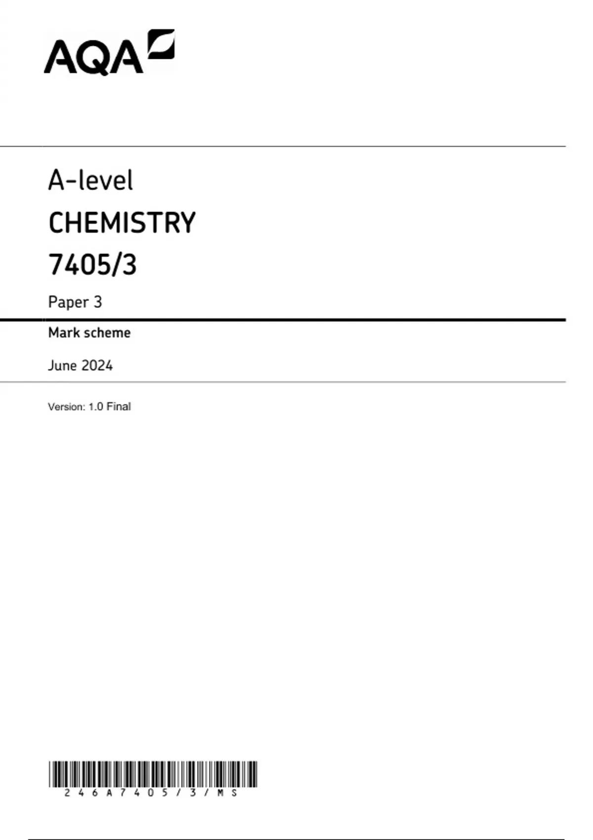 AQA A Level Chemistry Paper 3 Question Paper and Markscheme 2024 [VERIFIED]