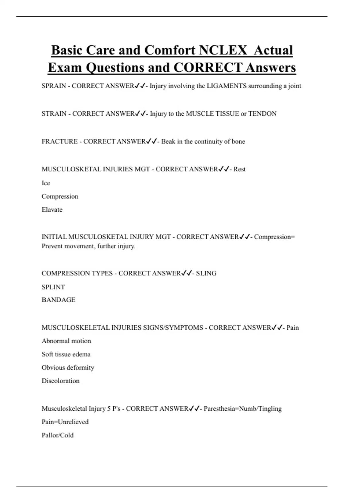 Basic Care and Comfort Bundled Exam Questions and CORRECT Answers