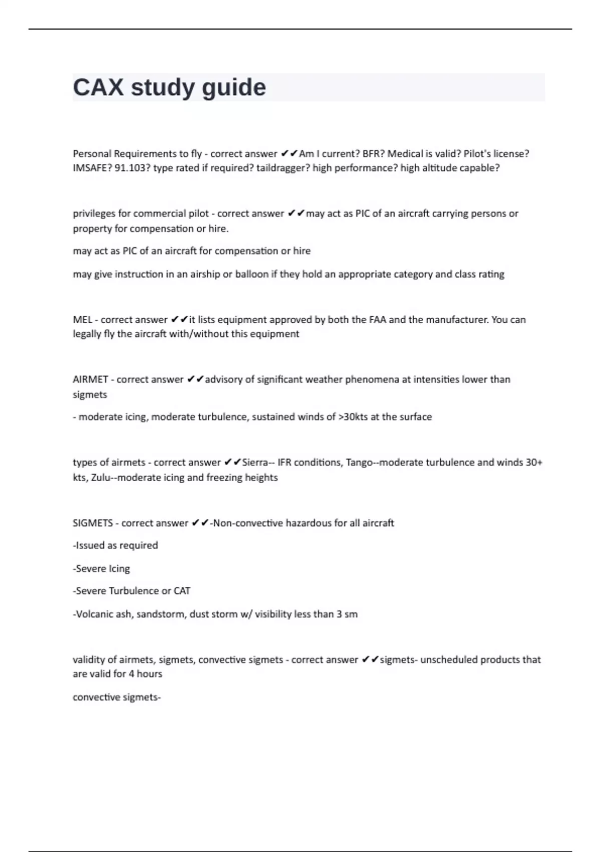 1 Exam (elaborations) CAX Check ride Study questions and correct answers 2 Exam (elaborations) CAX study stuff questions with verified answers 3 Exam (elaborations) CAX FAR s questions with 100% correct answers graded A+ passed