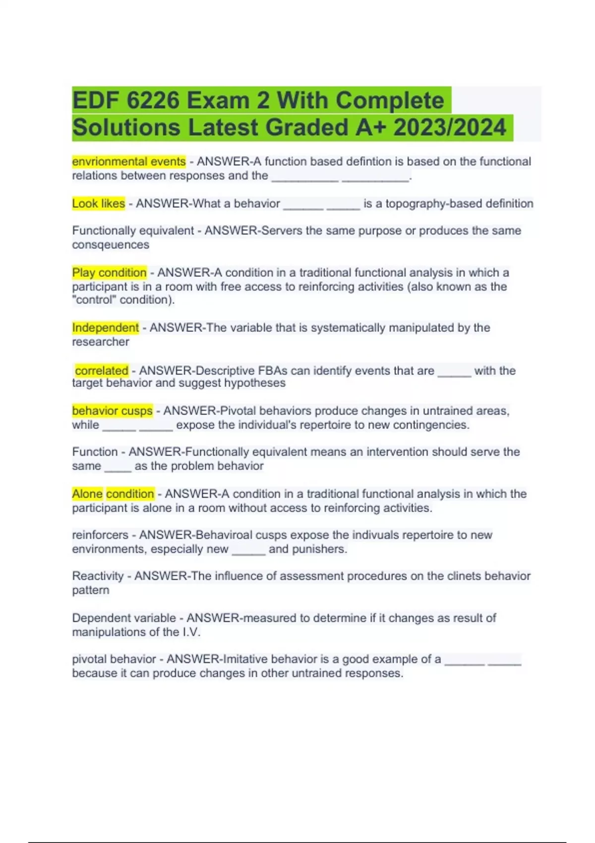EDF 6226 Exam Practice Questions With Complete Solutions - Latest | EDF 6226 Exam Sample Questions With Answers | Latest Update | EDF 6226 Midterm Exam Questions With Answers | EDF 6226 Final Exam Practice Questions With Answers & EDF 6226 Final Exam Questions With Answers Latest Updated (Graded 100%) University of West Florida