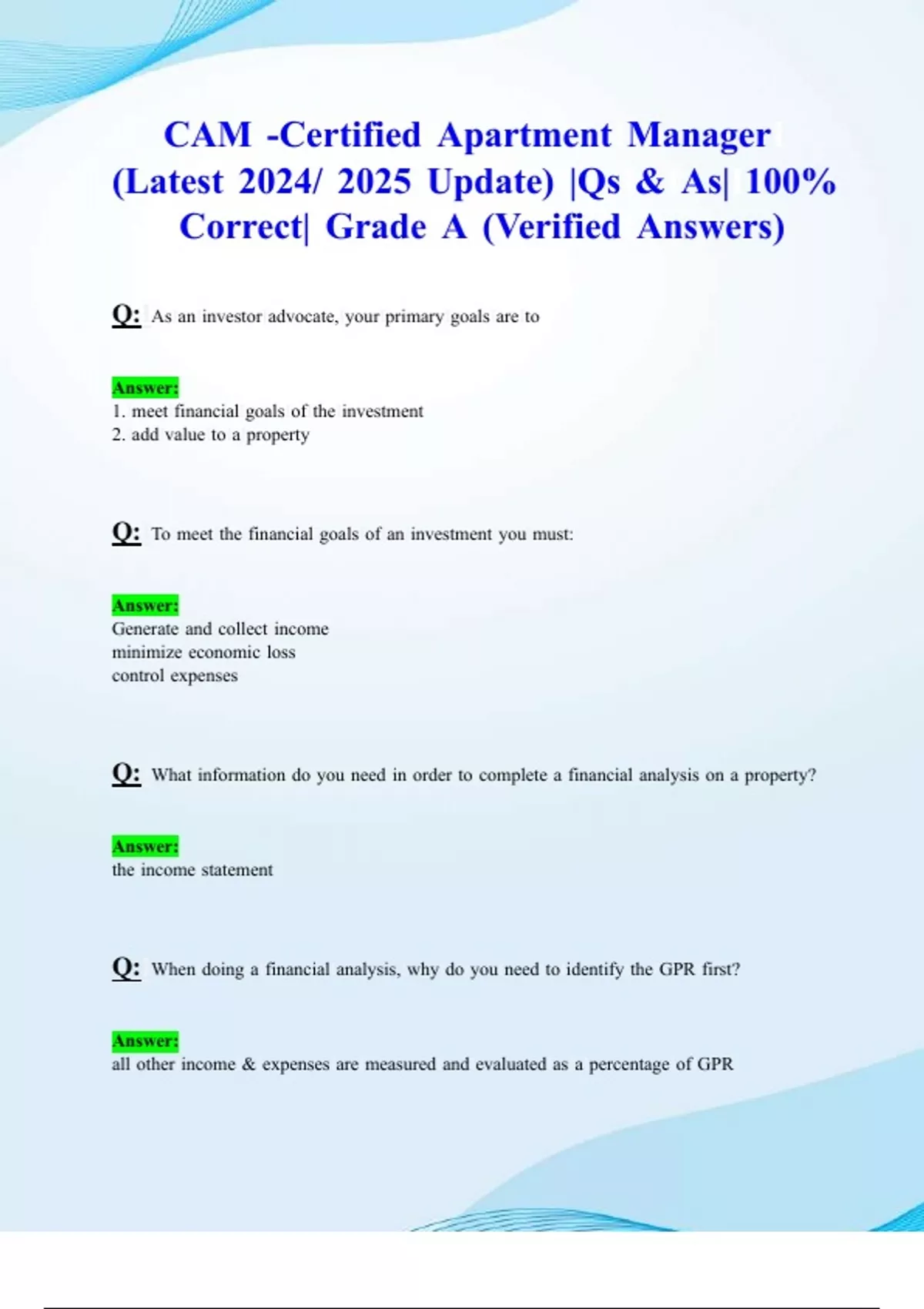 CAM -Certified Apartment Manager Exam Review (Latest 2024/ 2025 Update) |Qs & As| 100% Correct| Grade A (Verified Answers)