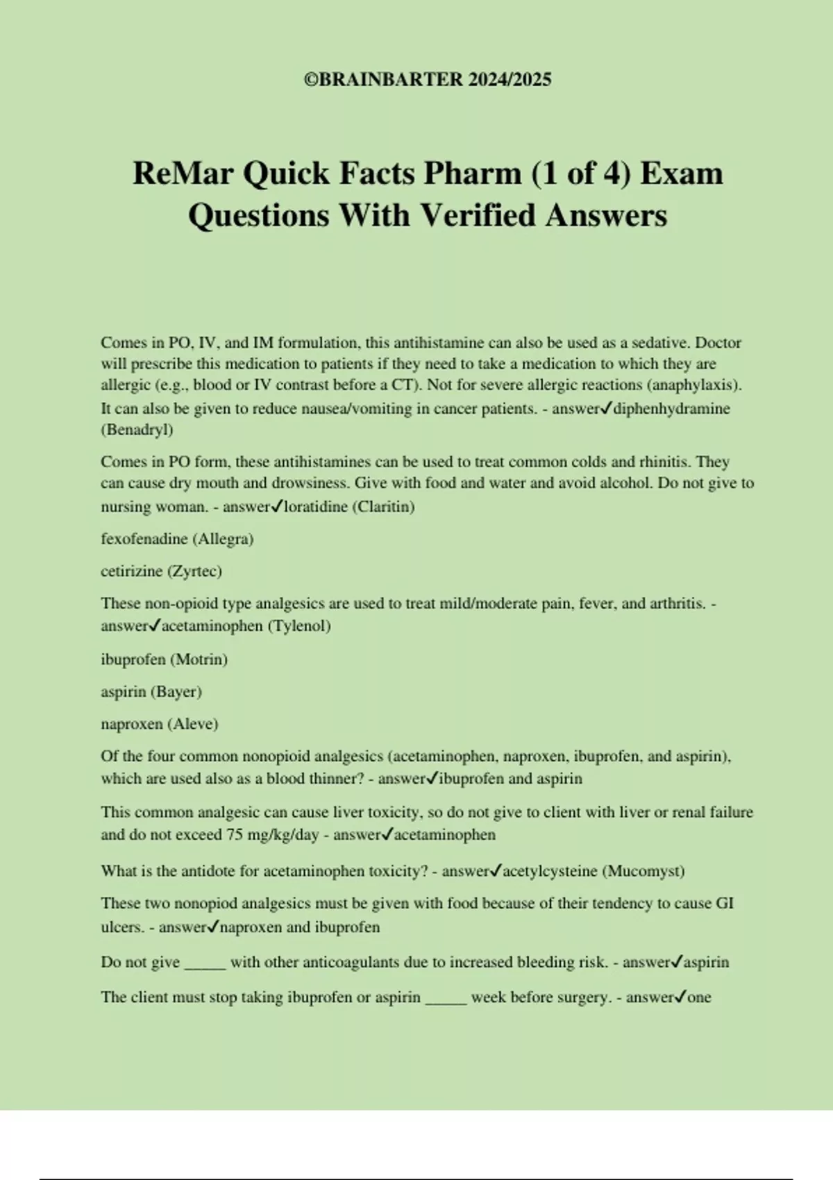 ReMar Quick Facts Pharm (1 of 4) Exam Questions With Verified Answers