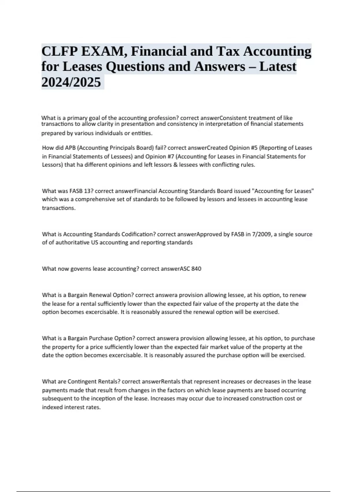 CLFP Exam Questions and Answers Latest Update | CLFP Exam - Credit Process and Financial Statement: Test Questions with Answers | CLFP Classification & Terminology in Leasing Exam Questions and Answers | CLFP EXAM, Financial and Tax Accounting for Leases Questions and Answers & CLFP Final Exam Questions With 100% Correct Answers Latest .