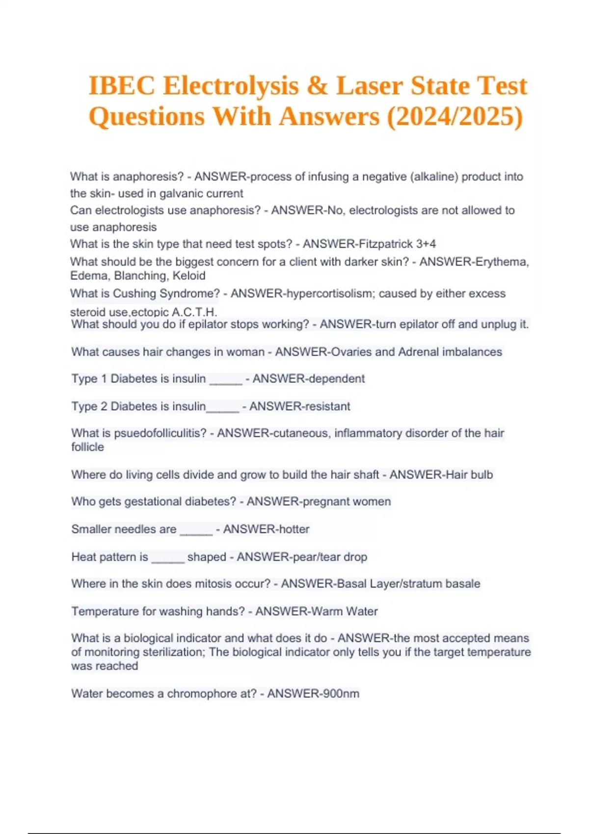 IBEC AElectrolysis +Laser STATE BOARD Practice Test Questions and Answers Updated 2024 | IBEC State Board Exam Questions and Answers | IBEC STATE BOARD PRACTICE TEST QUESTIONS WITH CORRECT ANSWERS | IBEC STATE BOARD Practice Test Questions with Answers &