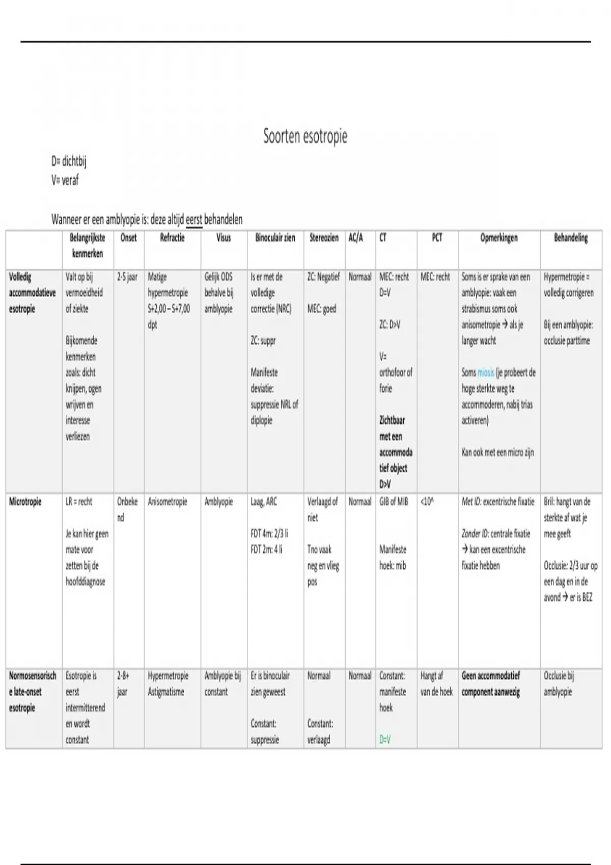 Samenvatting SK1: tabellen soorten esotropie