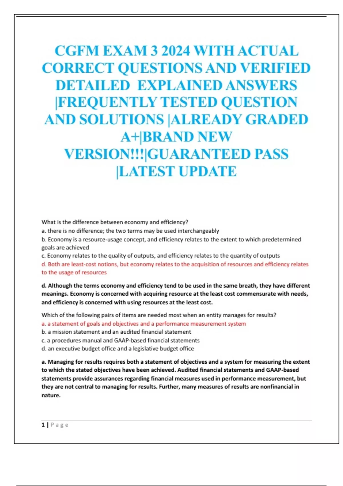 CGFM EXAM 1, 2, 3 2024 WITH ACTUAL CORRECT QUESTIONS AND VERIFIED DETAILED EXPLAINED ANSWERS |FREQUENTLY TESTED QUESTION AND SOLUTIONS |ALREADY GRADED A+|BRAND NEW VERSION!!!|GUARANTEED PASS |LATEST UPDATE