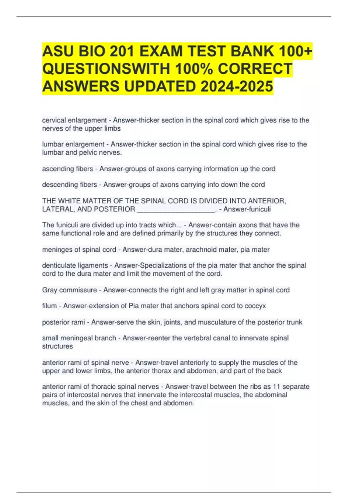 ASU BIO 201 EXAM TEST BANK 100+ QUESTIONSWITH 100% CORRECT ANSWERS UPDATED 2 Exam (elaborations) ASU BIO 201 BONE PRACTICE EXAM QUESTIONS WITH CORRECT DETAILED ANSWERS 3 Exam (elaborations) ASU BIO 201 HISTOLOGY EXAM NEWEST 2024 ACTUAL EXAM TEST BANK COMPLETE QUESTIONS AND CORRECT DETAILED ANSWERS 4 Exam (elaborations) ASU BIO 201 LAB
