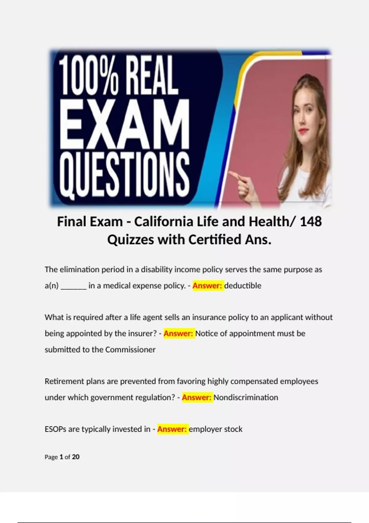 1 Exam (elaborations) California Life, Accident and Health Cram Course Exam 1-3/ 125+ Q&A 2 Exam (elaborations) California Life Accident and Health Exam Practice/ 353 Questions with Certified Answers/ 3 Exam (elaborations) Final Exam - California Life and Health/ 148 Quizzes with Certified Ans. 4 Exam (elaborations) California Life Ins