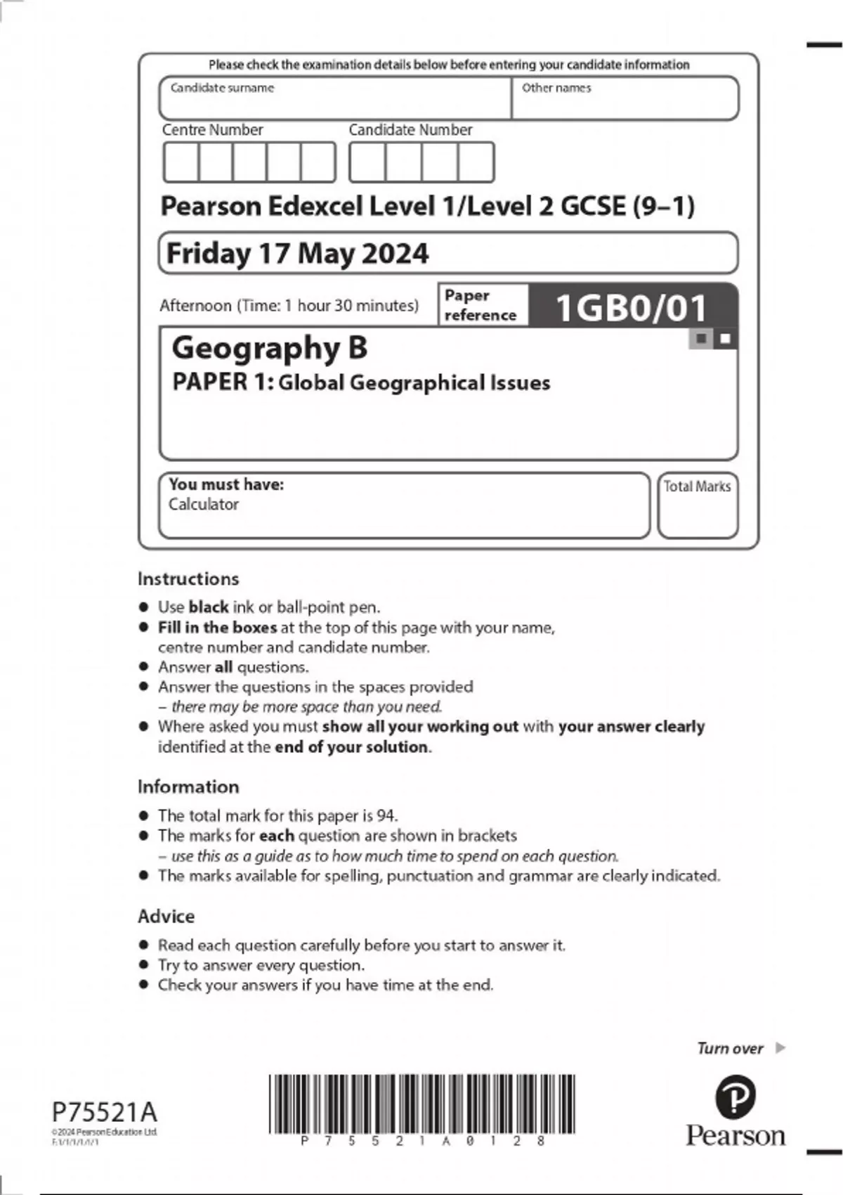 GCSE EDEXCEL May 2024 Geography B Paper 1