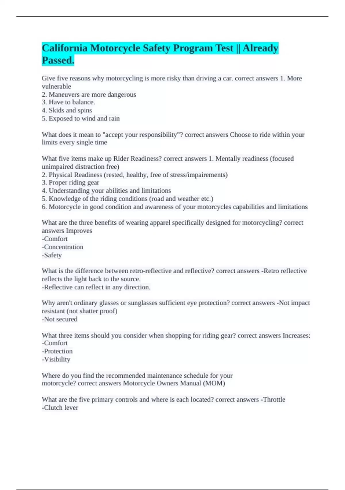 Motorcycle Safety Course || Questions and 100% Verified Answers.- California