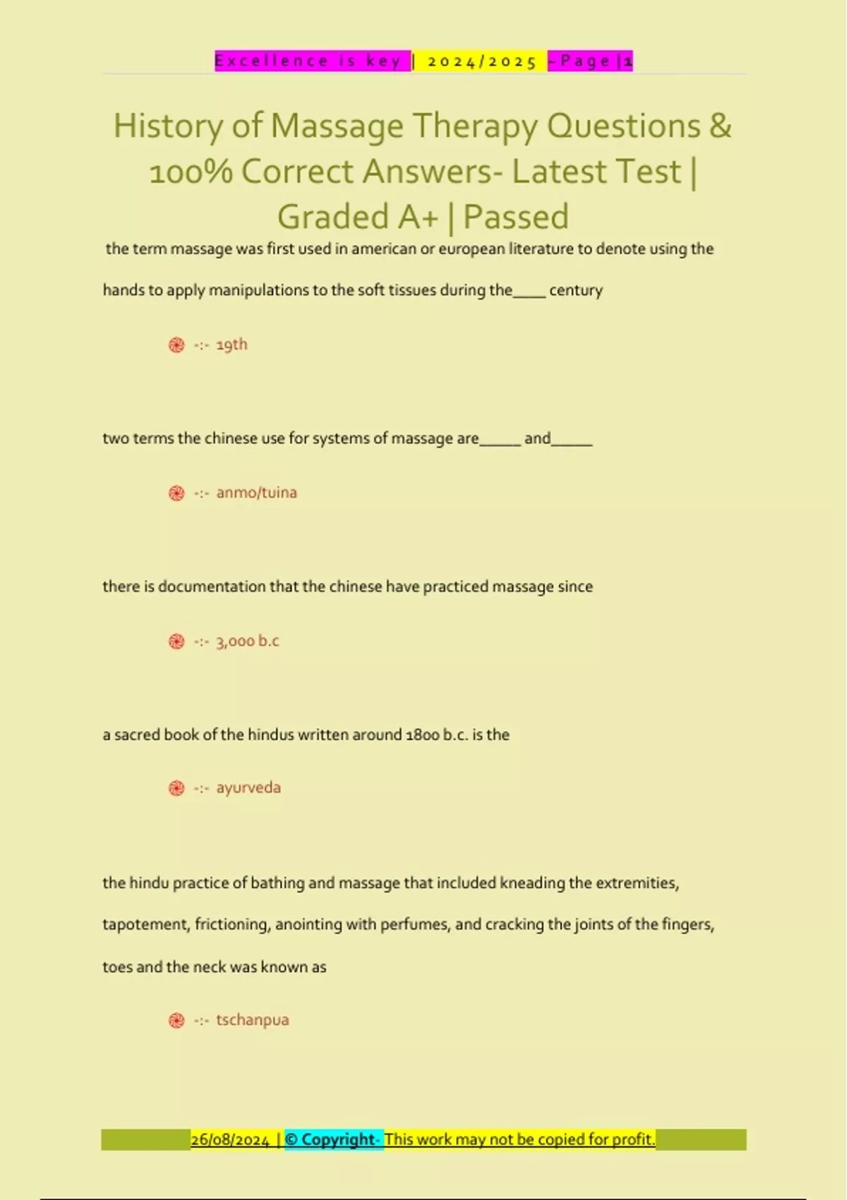 History of Massage Therapy Questions & 100% Correct Answers- Latest Test | Graded A+ | Passed