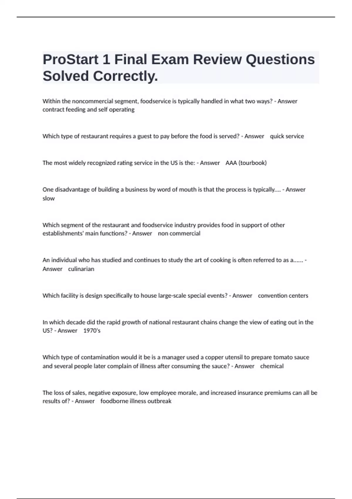 1 Exam (elaborations) Prostart Level 2 Practice Exam Questions And All Correct Answers. 2 Exam (elaborations) Prostart 2 - Exam Prep Questions With Solved Solutions. 3 Exam (elaborations) ProStart 2 Chapter 2 Menu Management Prep Exam Questions And Correct Answers. 4 Exam (elaborations) Prostart Midterm Exam Questions And Solved Solutions. 5 Ex