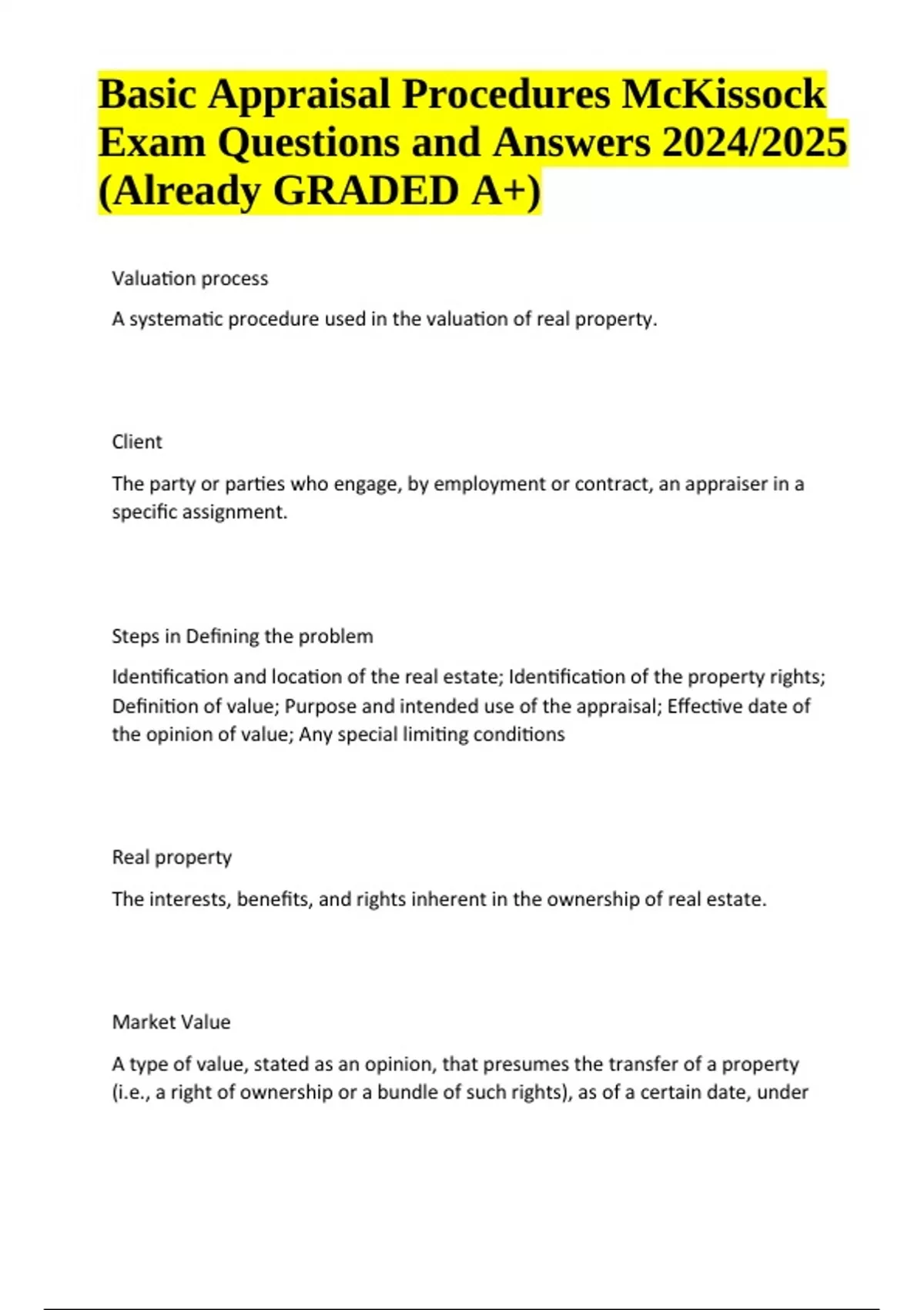 Basic Appraisal Procedures Exam Questions and Answers 2024/2025 | McKissock Basic Appraisal Principles Exam QUESTIONS With Answers & Mckissock Basic Appraisal Principles Exam Questions and Answers Latest Update 2024/2025 (Graded A+)