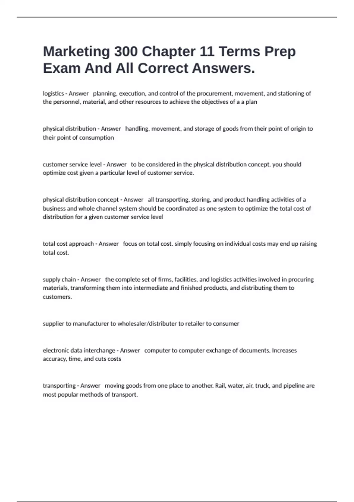 1 Exam (elaborations) MKT 300 Pricing Revision Exam Questions With Verified Solutions. 2 Exam (elaborations) MKT 300 Midterm 2 Test Questions With Complete Solutions. 3 Exam (elaborations) MKT 300 Exam 1 Chapter 4 Final Exam And All Correct Answers. 4 Exam (elaborations) MKT 300 Chapter 19 Test Questions With Guaranteed Pass Solutions. 5 Exam (