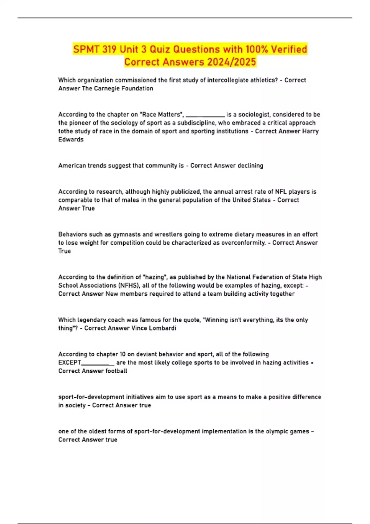 SPMT 319 Unit 3 Quiz Questions with 100% Verified Correct Answers 2024/2025