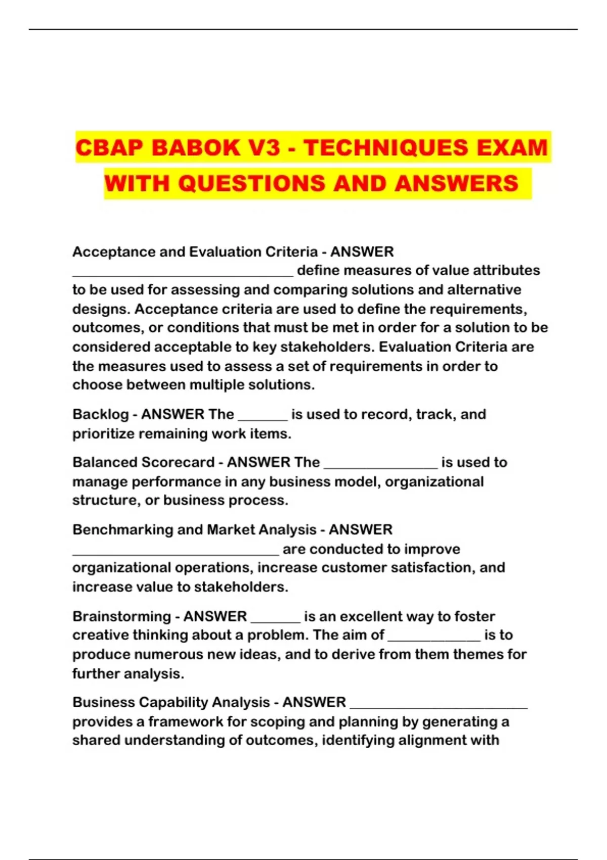 CBAP BABOK V3 - TECHNIQUES EXAM WITH QUESTIONS AND ANSWERS