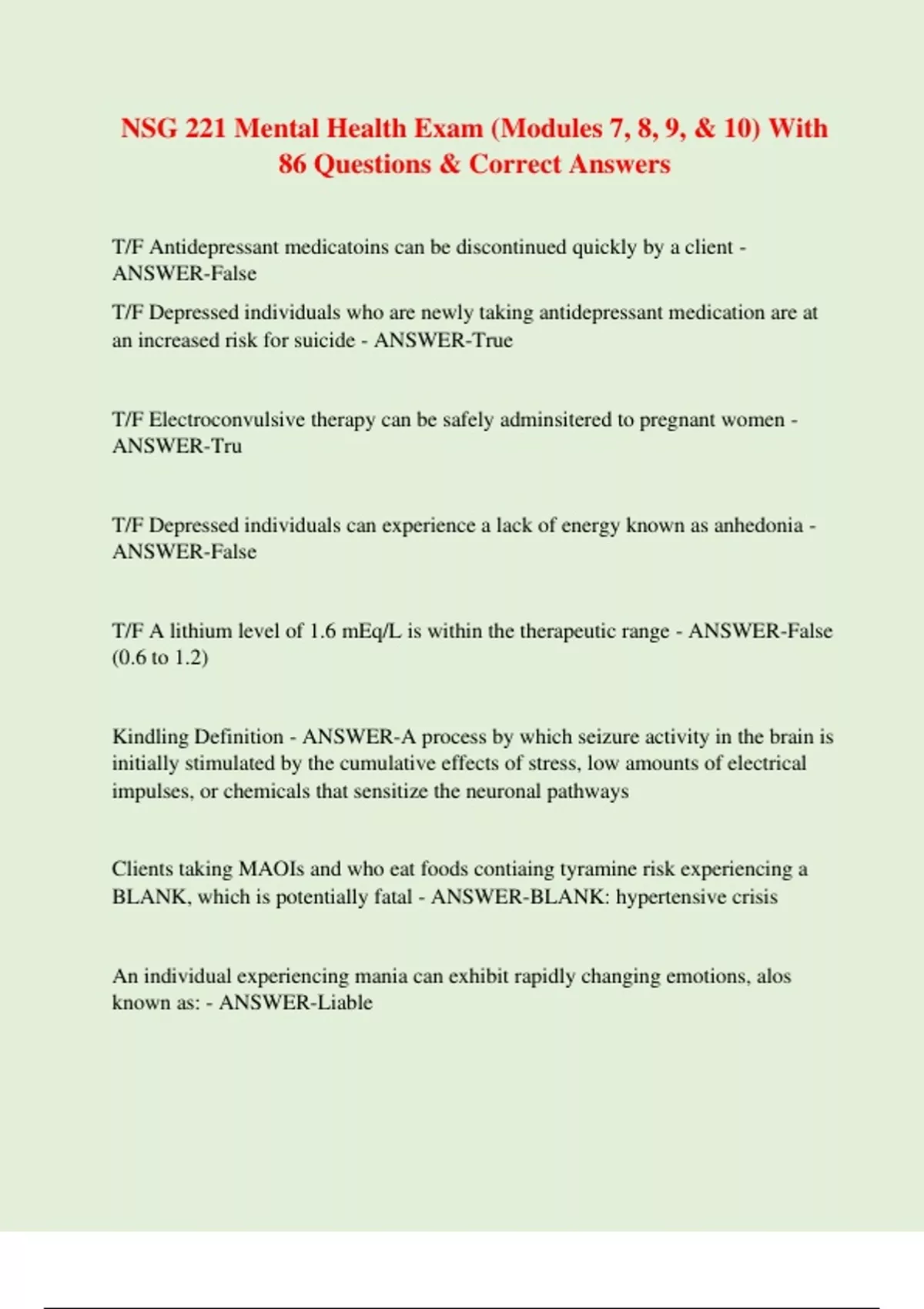 NSG 221 Mental Health Exam (Modules 7, 8, 9, & 10) With 86 Questions & Correct Answers