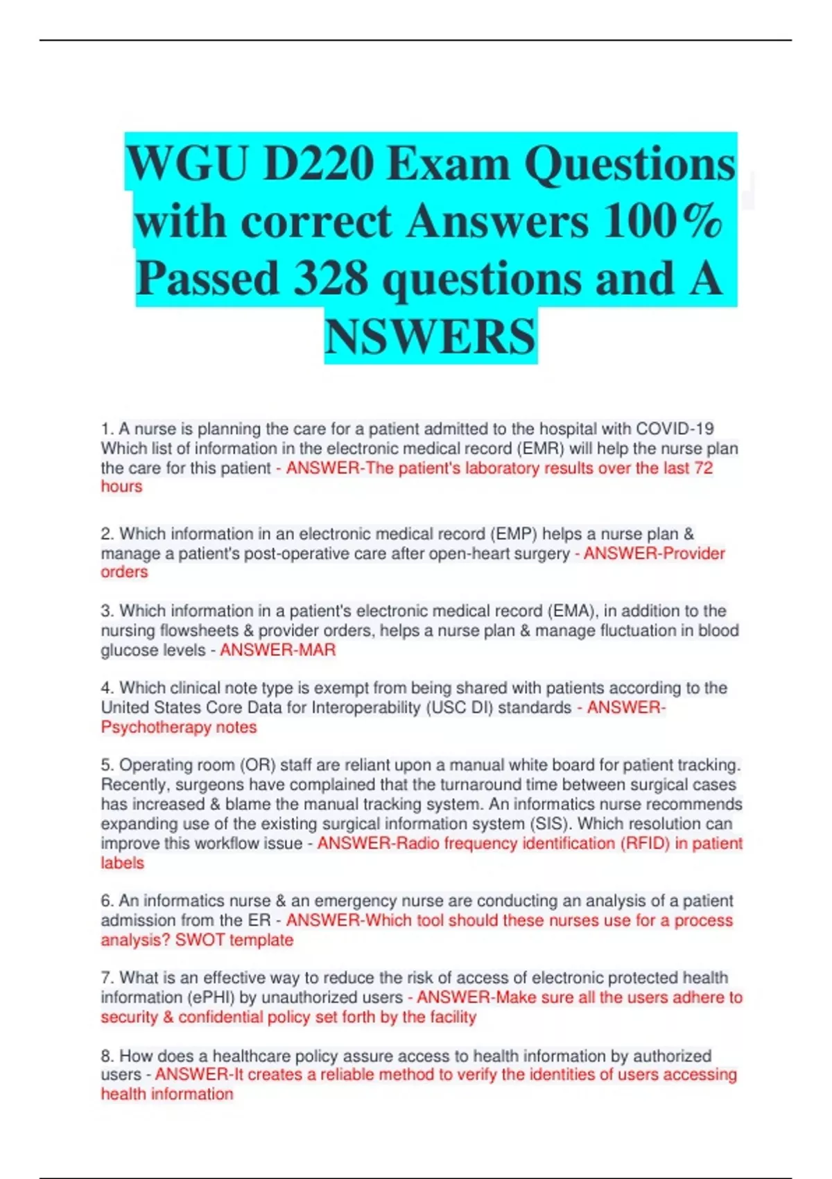 1 Exam (elaborations) WGU D220 Exam Questions with correct Answers 100% Passed 328 questions and A NSWERS 2 Exam (elaborations) WGU D220 Exam Questions with correct Answers 100% Passed 328 questions and A NSWERS 3 Exam (elaborations) WGU D220 INFORMATICS GRADED A 2023 4 Exam (elaborations) WGU D220 INFORMATICS GRADED A 2023