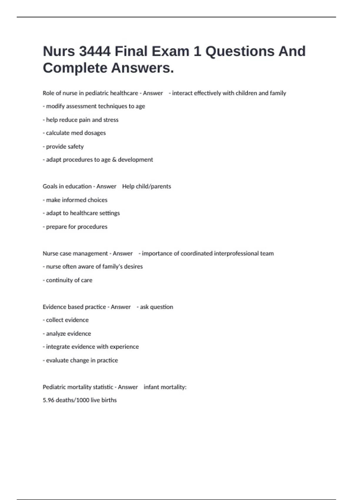 1 Exam (elaborations) NURS 3444 (Peds) EXAM 3 Review Questions Solved Correctly. 2 Exam (elaborations) NURS 3444 Module 6 Practice Exam Questions And All Correct Answers. 3 Exam (elaborations) NURS 3444 Mid Semester Exam 4 Questions And Already Passed Answers. 4 Exam (elaborations) NURS 3444 Exam 5 Practice Questions Answered Correctly. 5 Exam