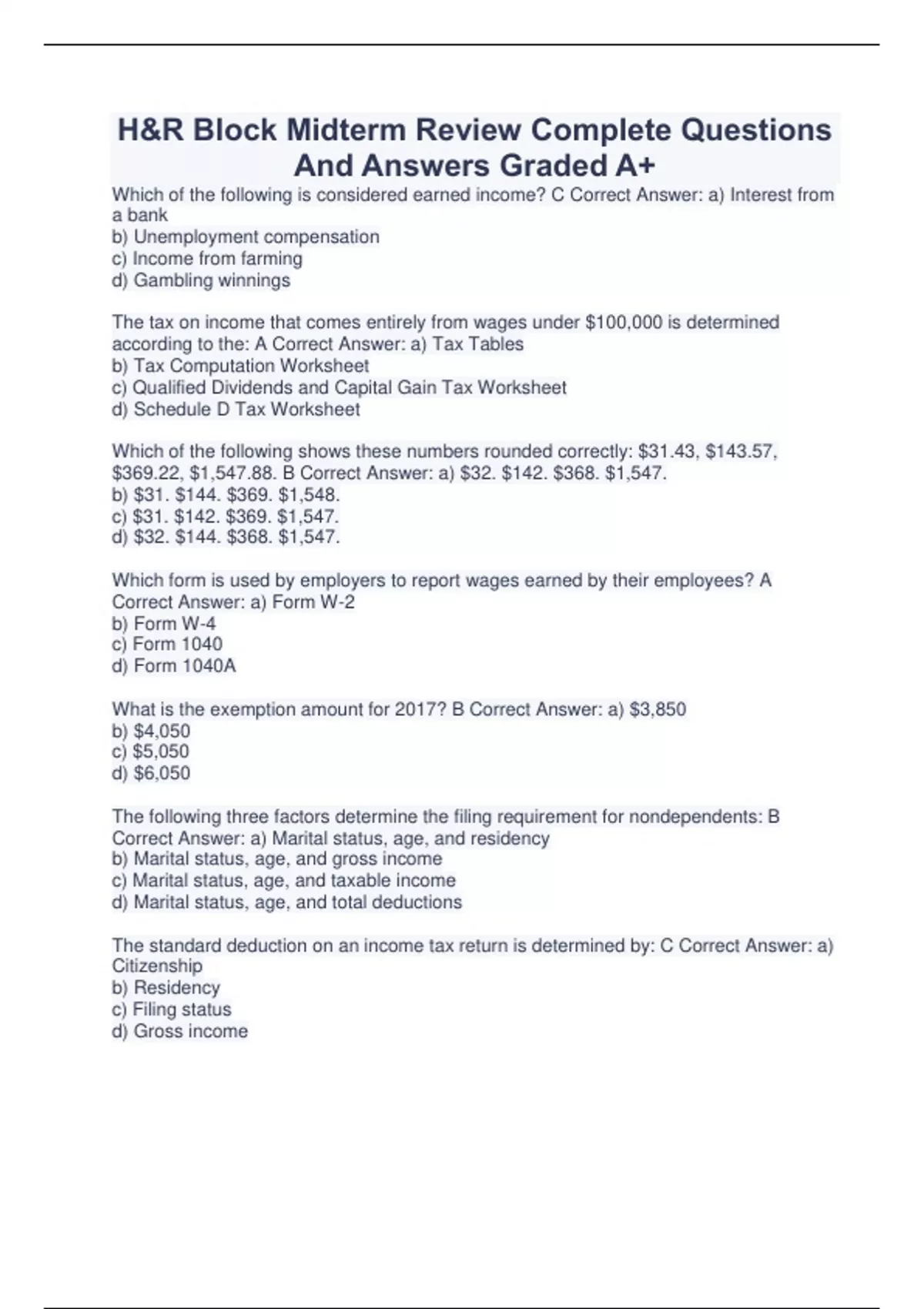 H&R BLOCK Package Deal With Verified Study Solutions Rated A+