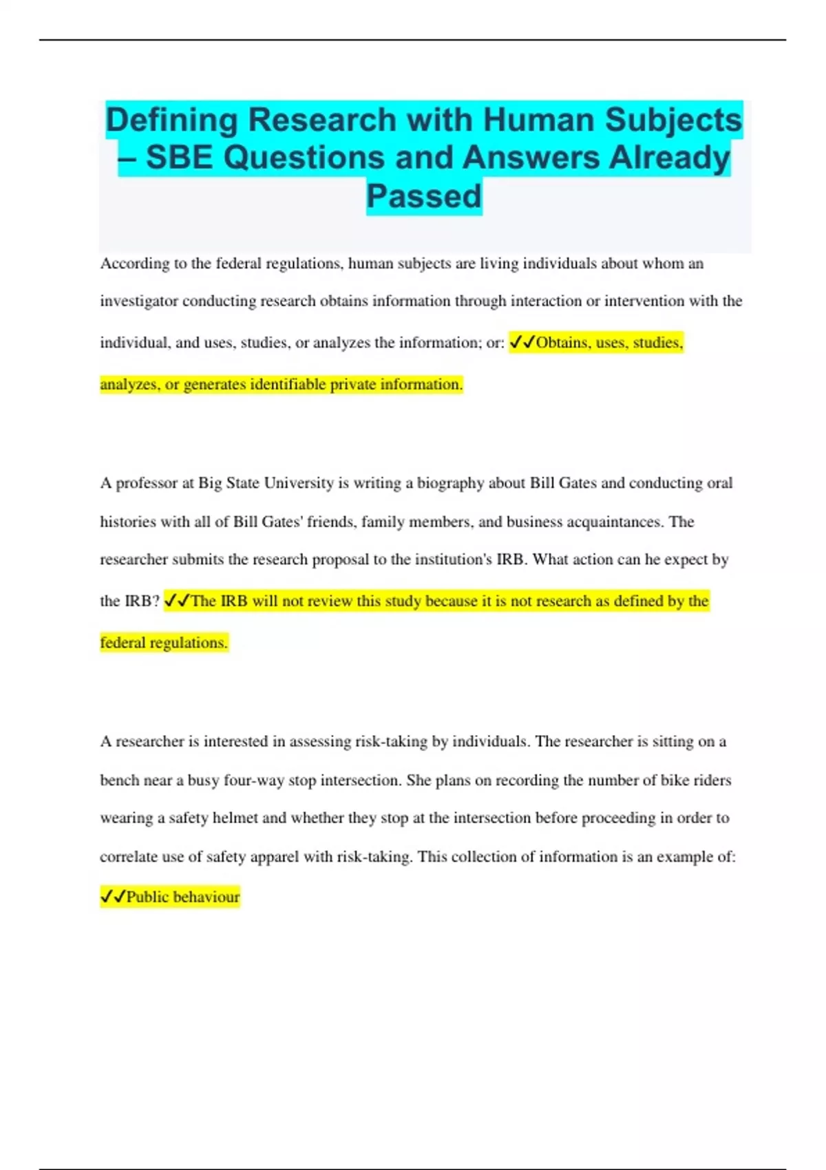 Defining Research with Human Subjects – SBE Bundled Exams Questions and Answers Latest Versions (2024/2025) (Complete and Accurate)