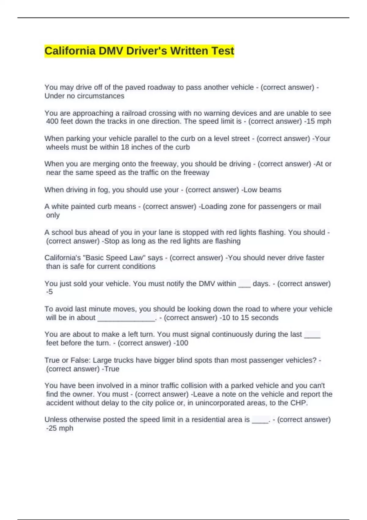 California Driver- License Written Test Practice Questions And Answers.