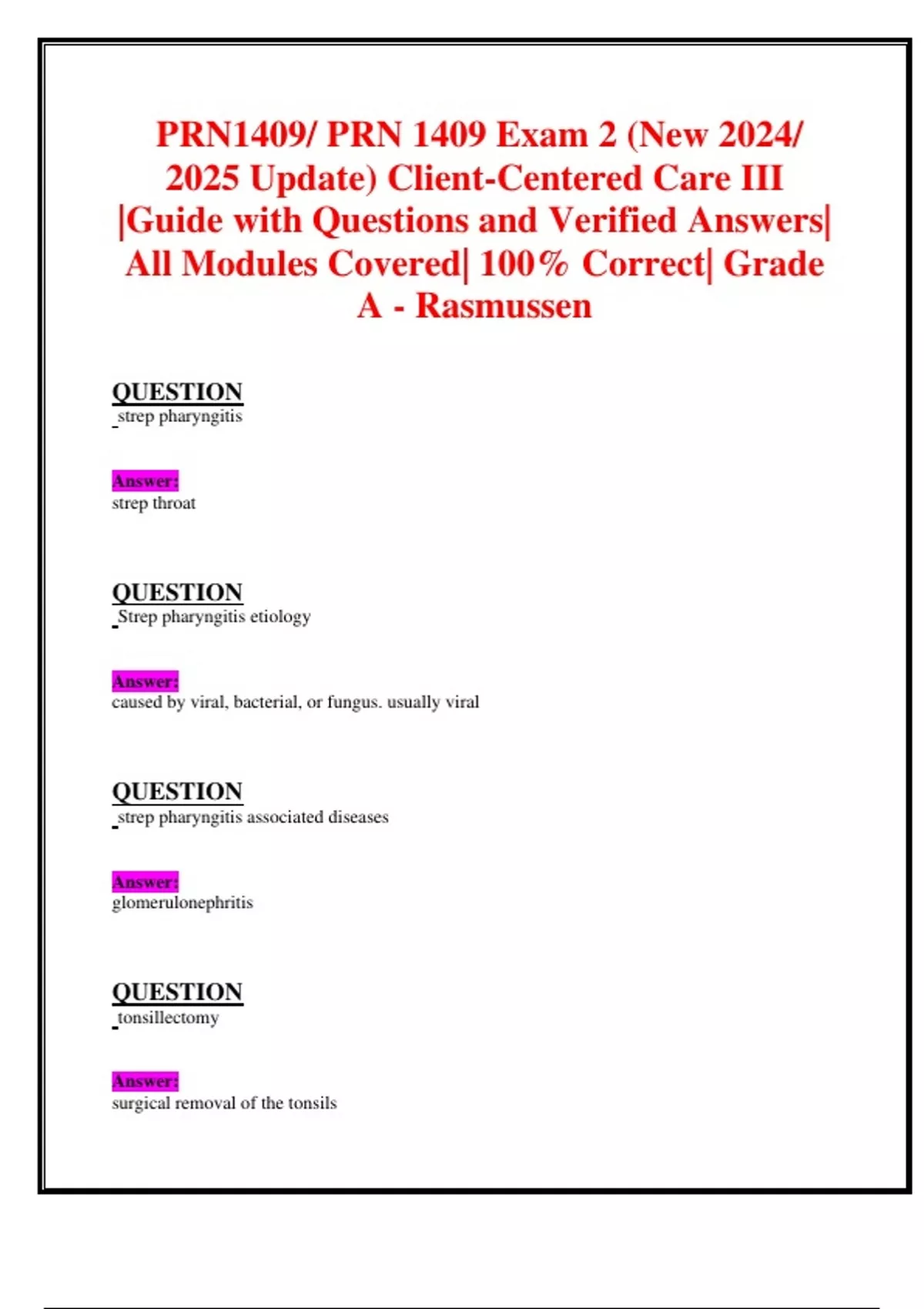 Exam 2: PRN1409/ PRN 1409 (ALL NEW 2024/ 2025 Updates BUNDLED TOGETHER PACKAGE WITH SOLUTIONS) Client-Centered Care III| Questions and Verified Answers| 100% Correct| A Grade - Rasmussen
