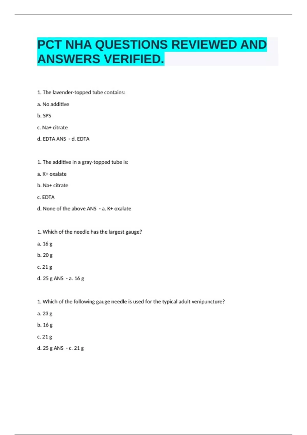 PCT, Phlebotomy questions and answers respectively.