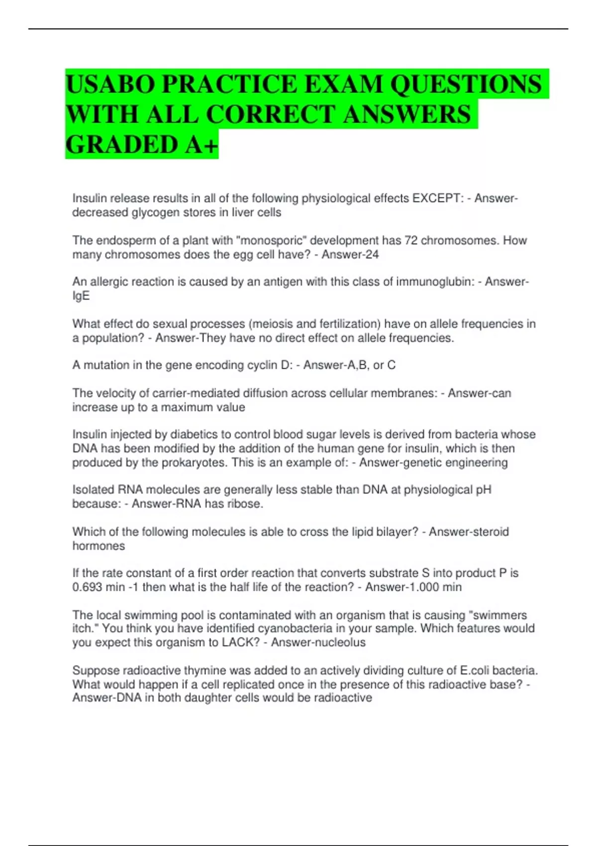 Bundle For USABO PRACTICE EXAM QUESTIONS WITH ALL CORRECT ANSWERS GRADED A+