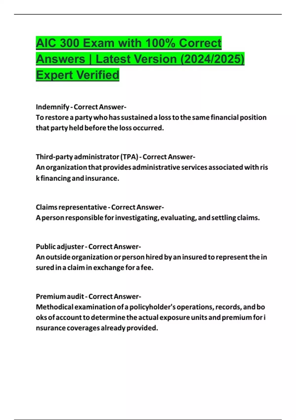 AIC 300 Exam with 100% Correct Answers | Latest Version (2024/2025) Expert Verified AIC 300 Practice Test Study Guide Questions with 100% Correct Answers | Verified | Latest Update AIC 300 Exam Questions With 100% Correct Answers 2024 AIC 300 - Claims in an Evolving World Exam with 100% Correct Answers | Latest Version (2024/2025) Expert Verified