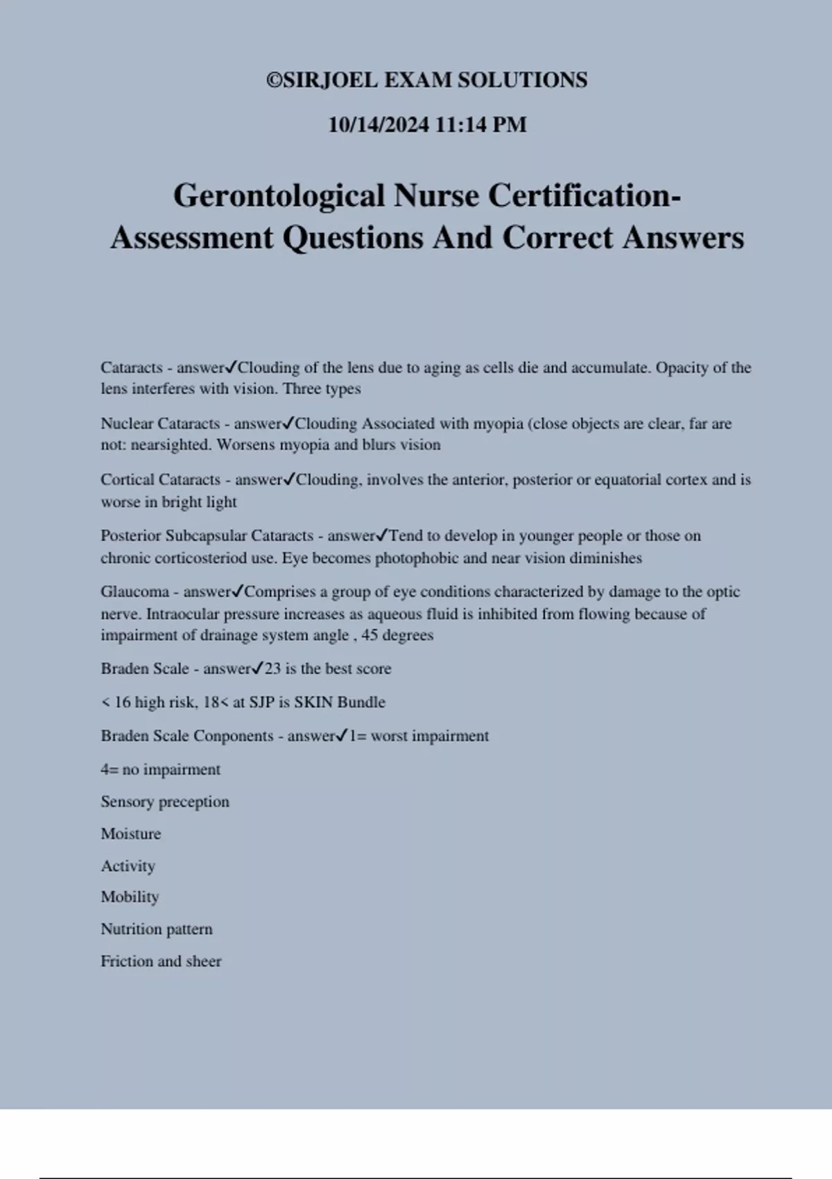 Gerontological Nurse Certification- Assessment Questions And Correct Answers