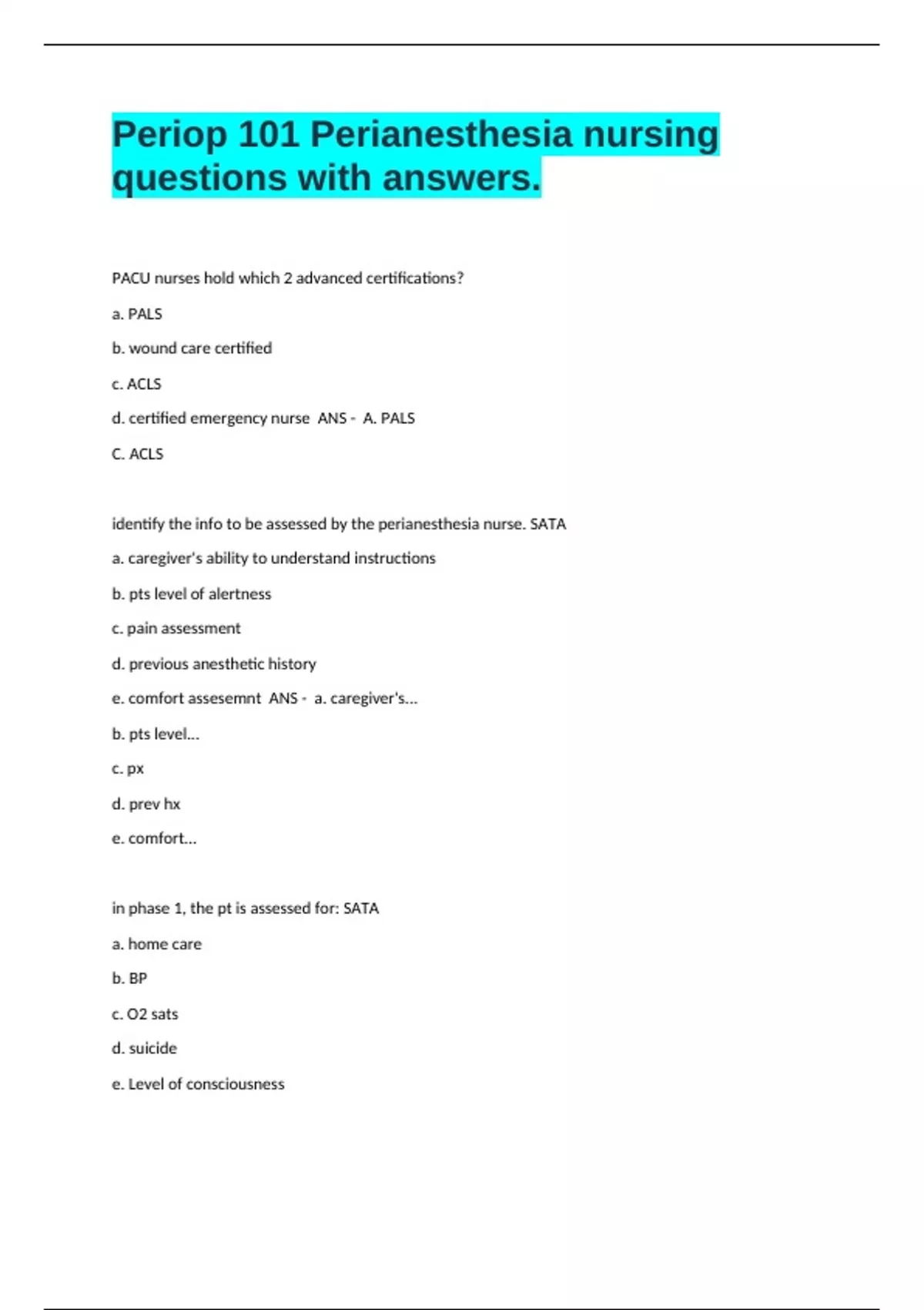 Perianesthesia Nursing questions & ANSWERS UPDATED 2024 - 25