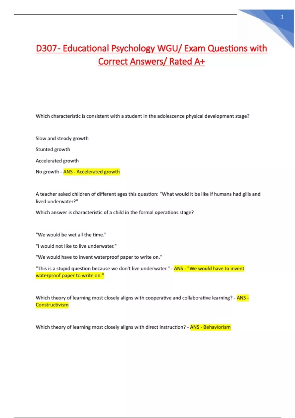 D307 - Educational Psychology WGU Latest update 2024 – 2025 Compilation Exams/Questions with Verified Answers/ Rated A