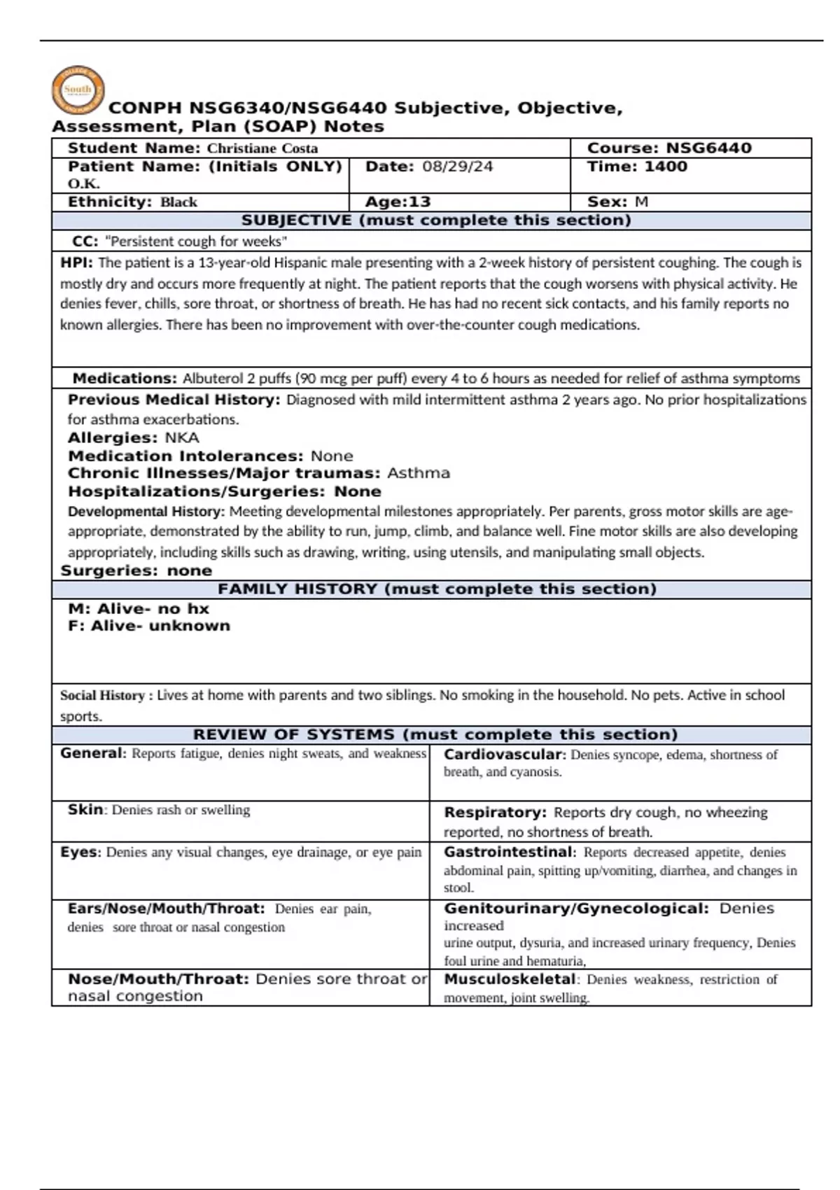 CONPH NSG6340/NSG6440 Subjective, Objective, Assessment, Plan (SOAP) Notes