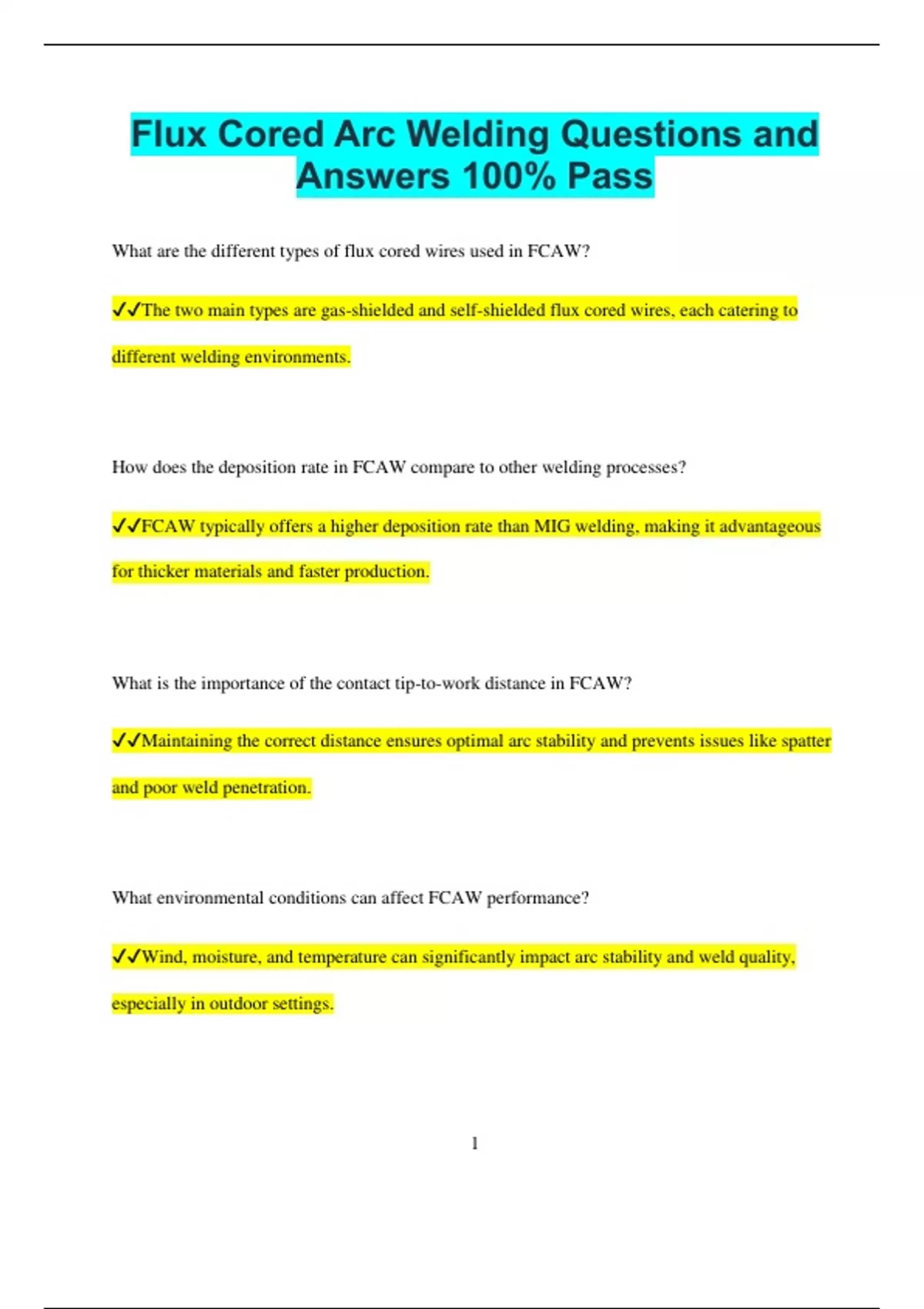 Flux Cored Arc Welding Questions and Answers 100% Pass