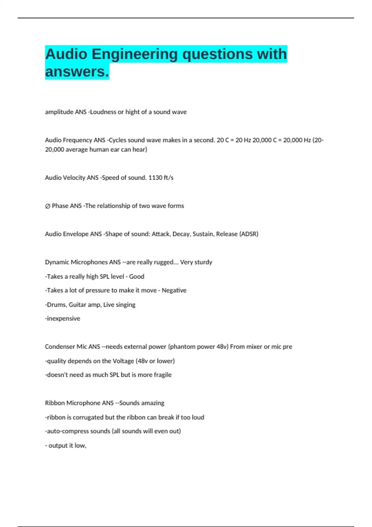 AUDIO ENGINEERING QUESTIONS AND ANSWERS UPDATED 2024/25