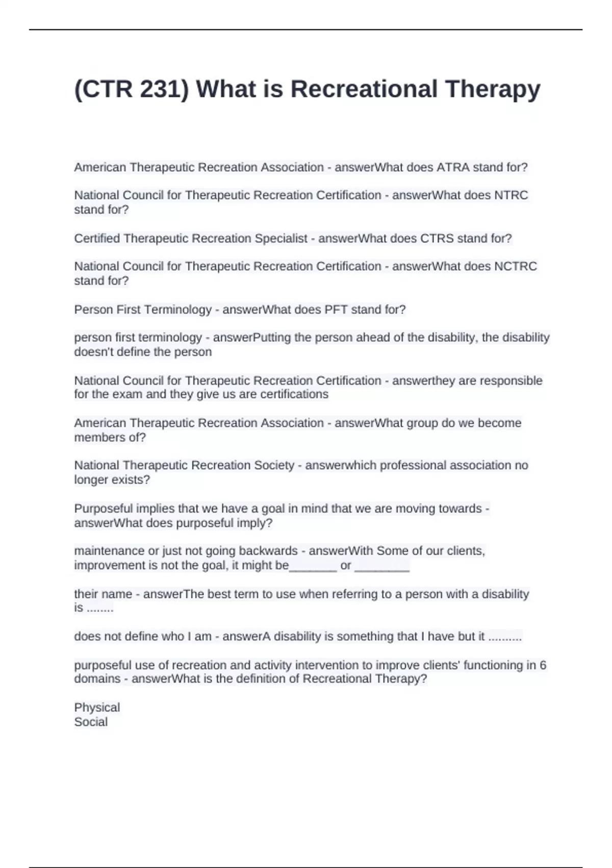 Exam (elaborations) TR Assessments- CTRS Study Group Questions and Answers Exam (elaborations) Study Guide for NCTRC exam Questions and Answers 2024 Exam (elaborations) Rec Therapy Exit Exam-Practice Exam 1 Questions and Answers 100% Solved Exam (elaborations) Practice test 4 Questions and Answers Graded A+ Exam (elaborations) Practice Tes