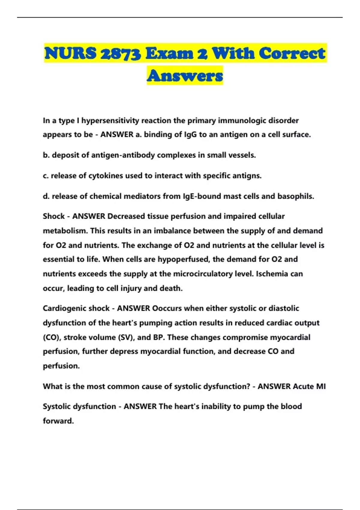NURS 2873 Exam 2 With Correct Answers