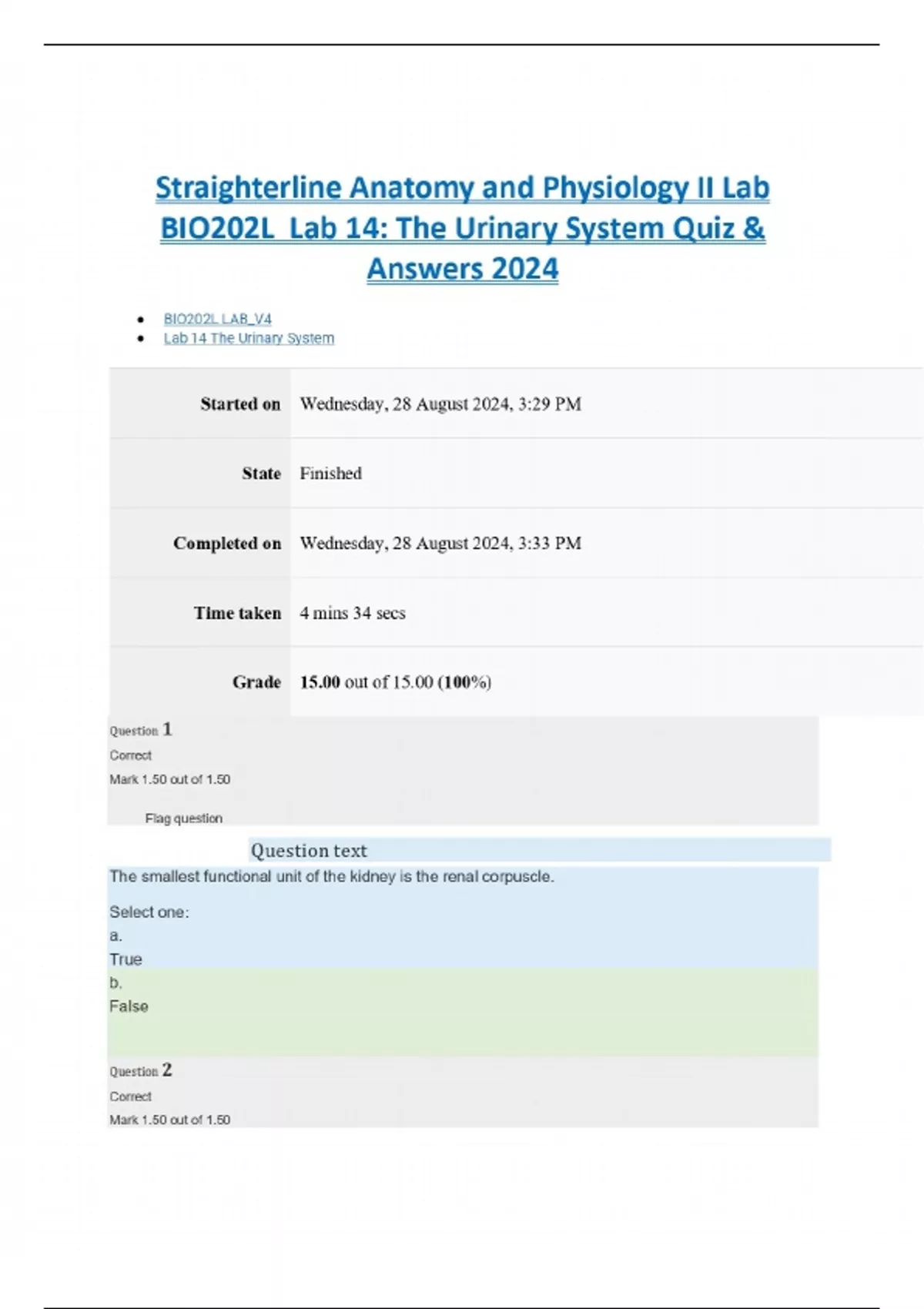 Straighterline Anatomy and Physiology II Lab BIO202L Lab 14: The Urinary System Quiz & Answers 2024 2 Exam (elaborations) Straighterline Anatomy and Physiology II Lab BIO202L Lab 15: Electrolytes, Water, Acids, and Bases Quiz & Answers 2024 3 Exam (elaborations) Straighterline Anatomy and Physiology II Lab BIO202L Lab 16: The Digestive System Qui