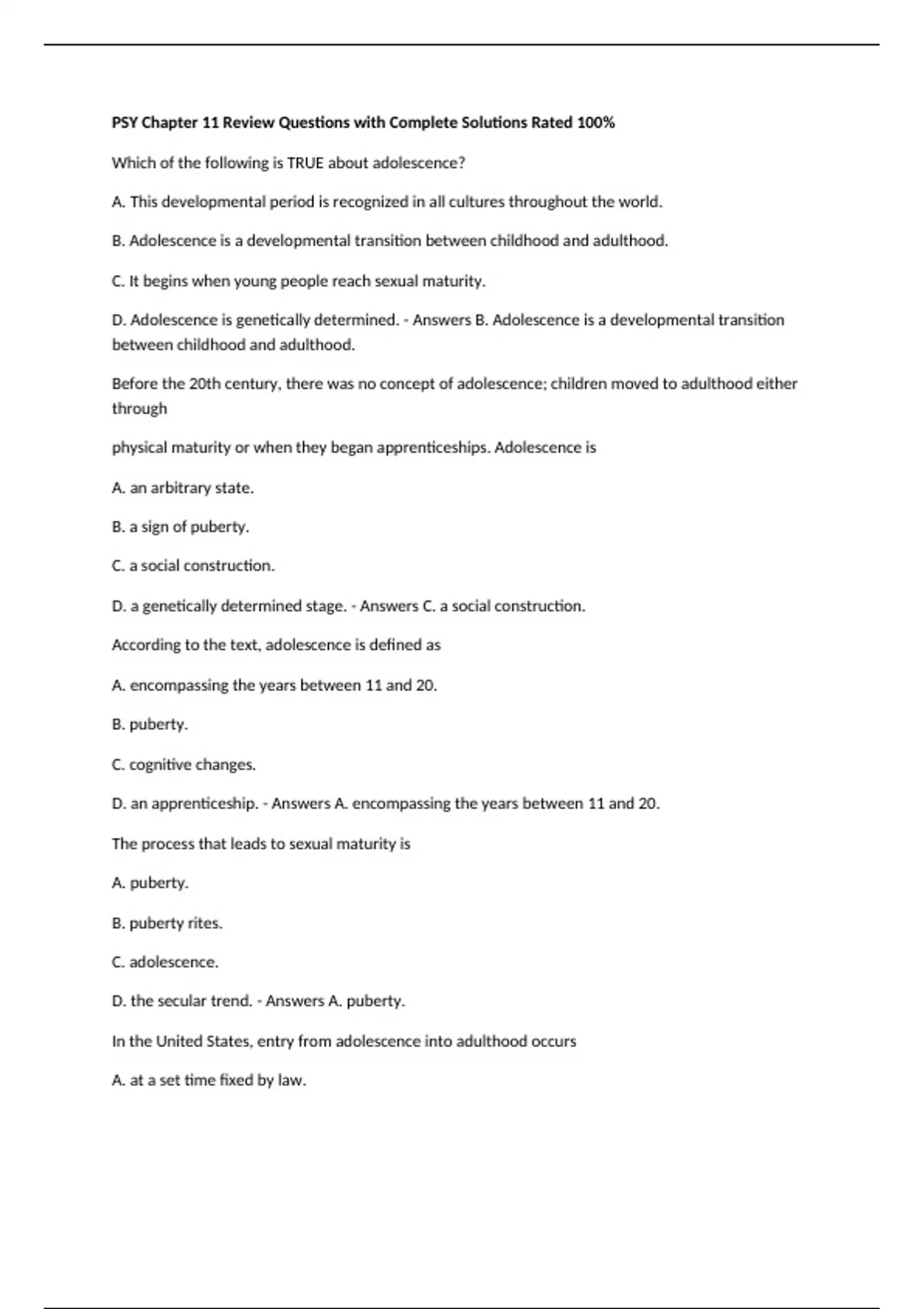 PSY Chapter 11 Review Questions with Complete Solutions Rated 100%