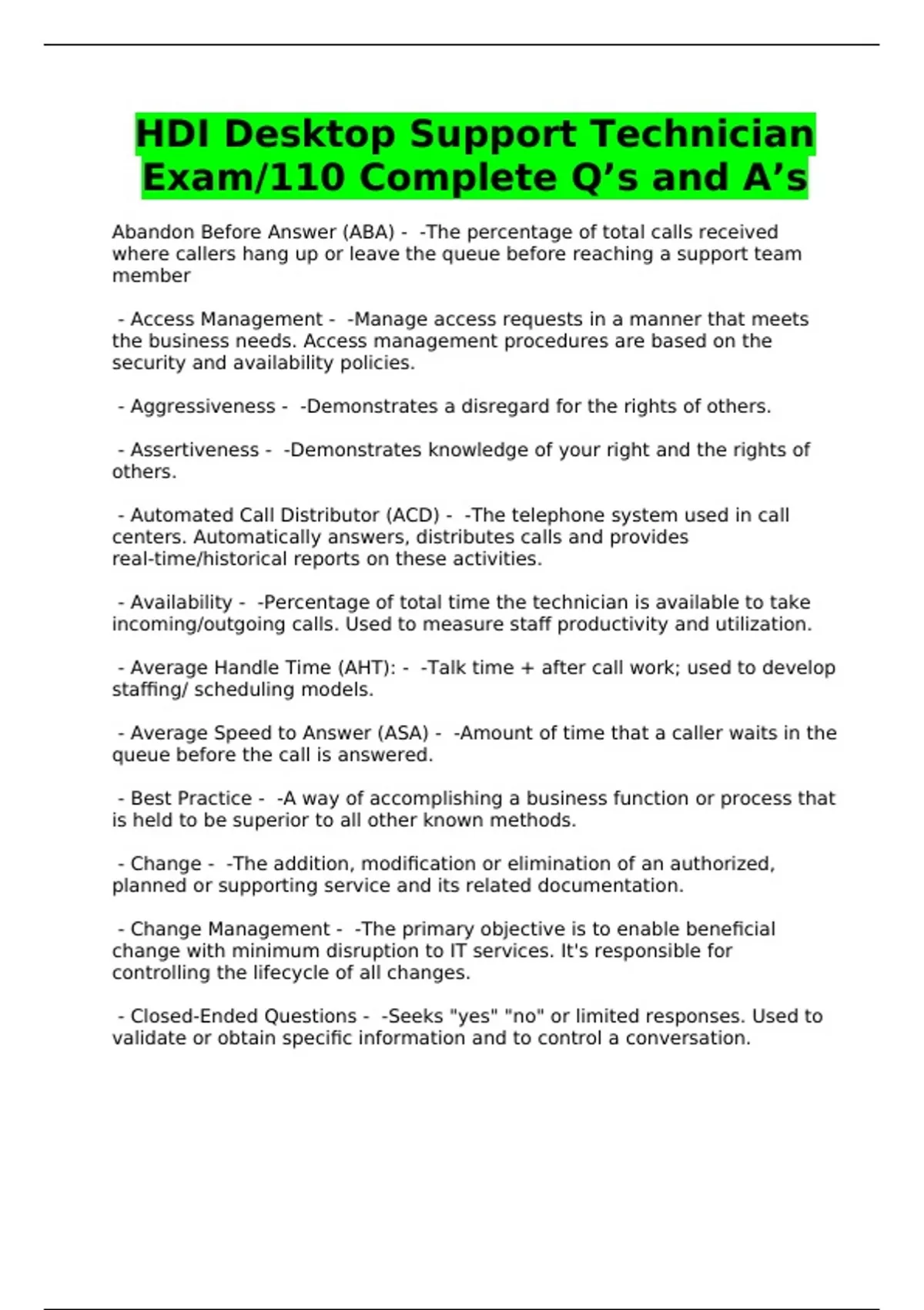 HDI Desktop Support Technician Exam/110 Complete Q’s and A’s