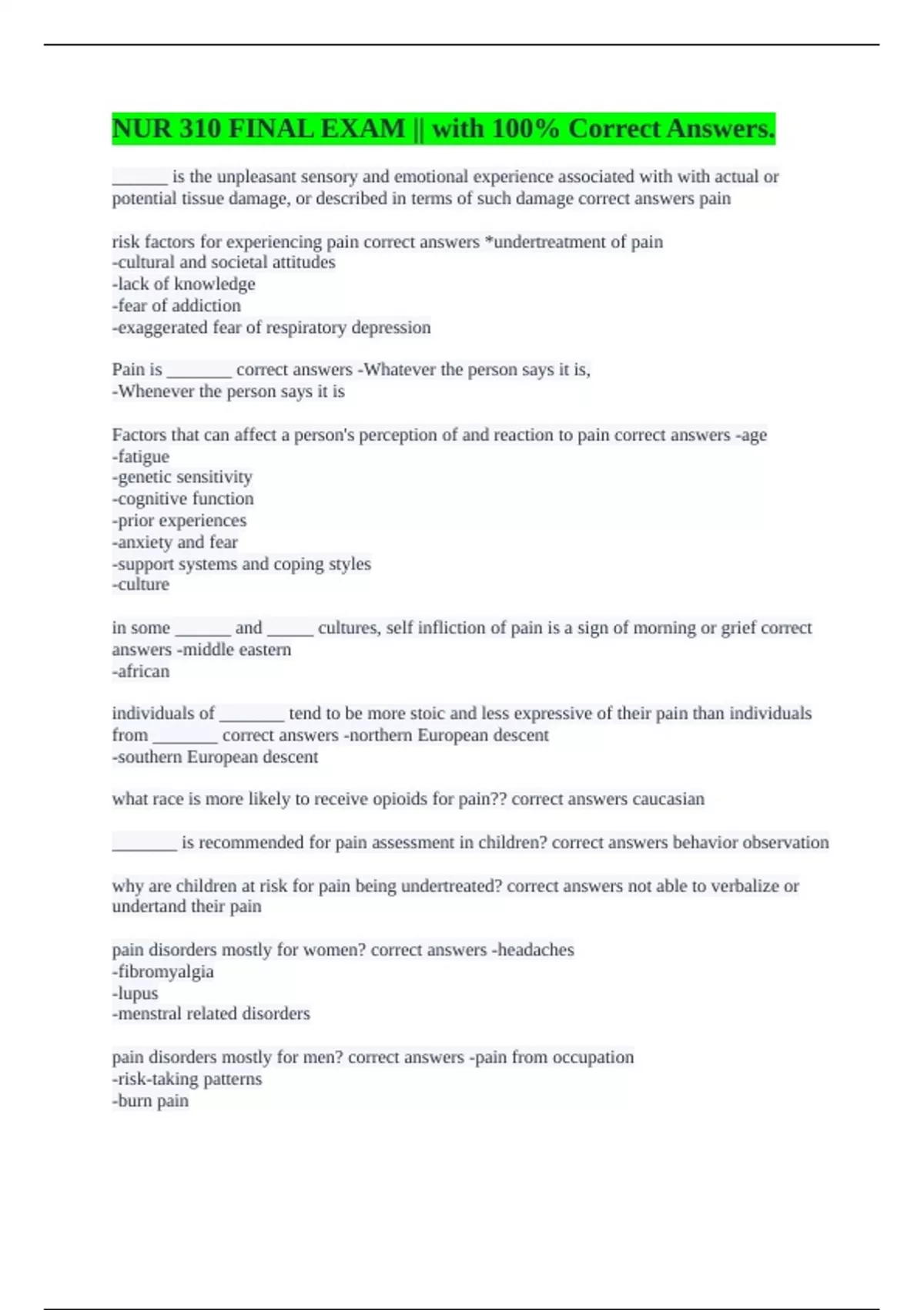 NUR 310 || All Questions Answered Correctly.