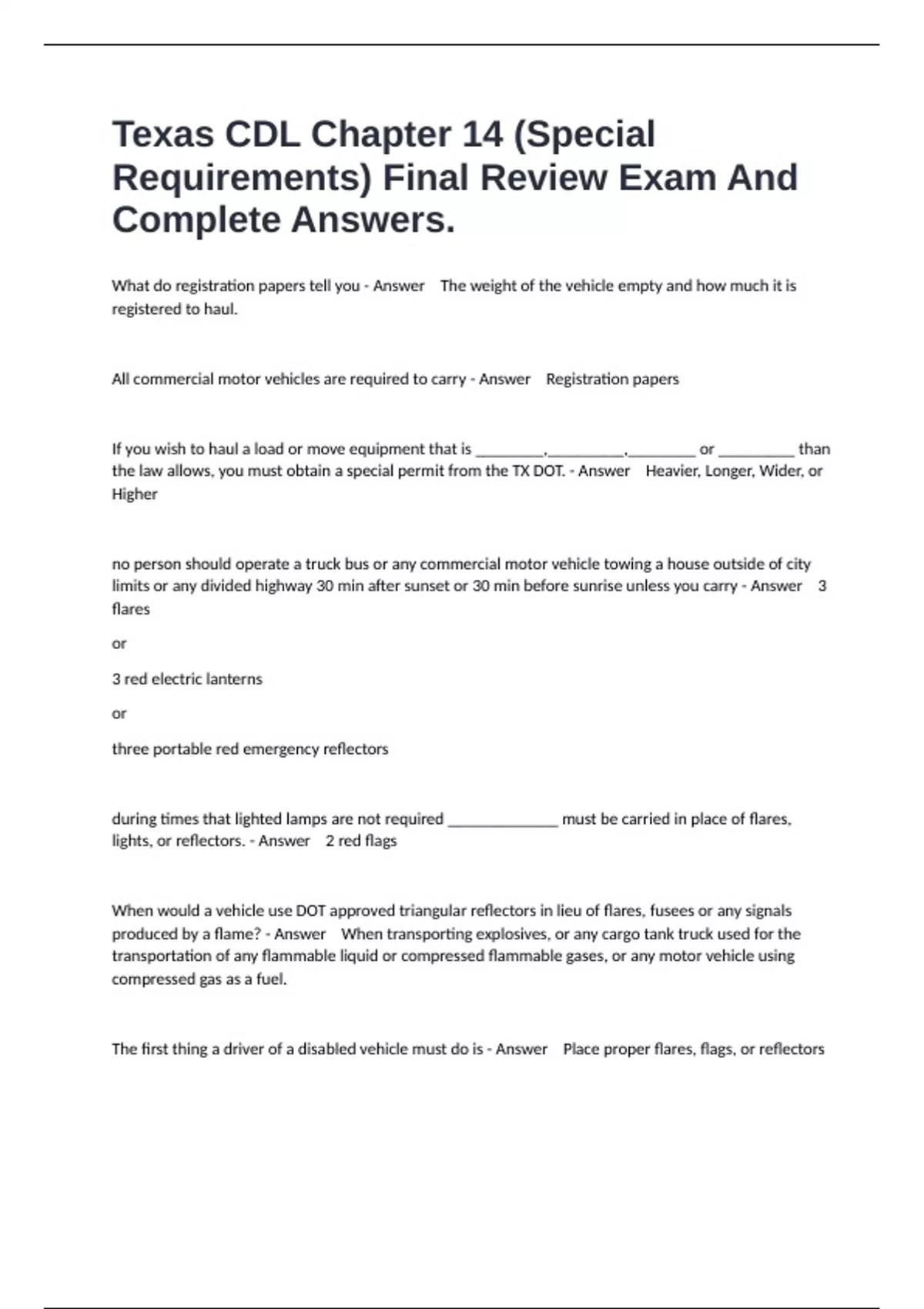 1 Exam (elaborations) Special Requirements 3 Practice Exam Questions And All Correct Answers. 2 Exam (elaborations) Texas cdl special requirements practice test Questions And Already Passed Answers. 3 Exam (elaborations) Texas CDL Section 1, 2 & 3 Revision Exam Questions And All Complete Answers. 4 Exam (elaborations) Texas CDL General Knowledge