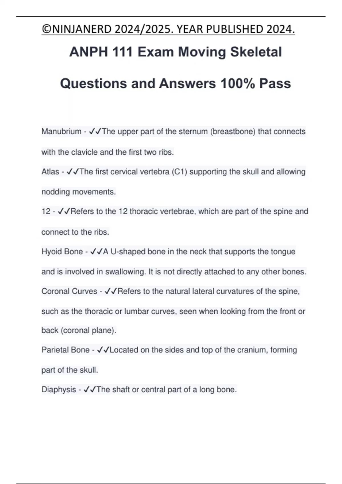 ANPH 111 Exam Moving Skeletal Questions and Answers 100% Pass