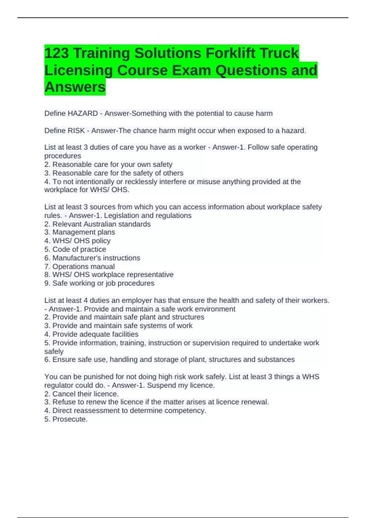Exam (elaborations) 123 Training Solutions Forklift Truck Licensing Course Exam Questions and Answers Exam (elaborations) 123 Training Solutions Order Picker Forklift Licensing Course Exam Questions and Answers Exam (elaborations) Forklift Assessment Exam Questions with Correct Answers Exam (elaborations) Forklift Certification Exam Question