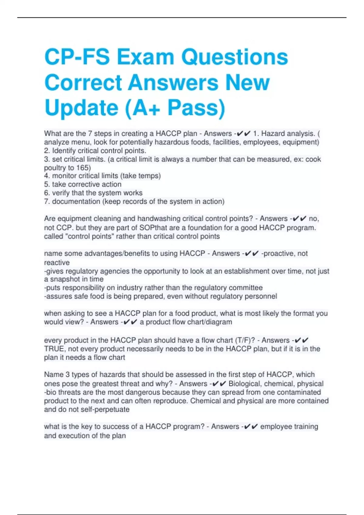 1 Exam (elaborations) CP-FS Practice EXAM TEST QUESTIONS AND ANSWERS VERIFIED LATEST UPDATE 2 Exam (elaborations) Certified Professional Food Safety (CP-FS) EXAM TEST QUESTIONS AND ANSWERS VERIFIED LATEST UPDATE 3 Exam (elaborations) CP-FS Exam Questions Correctly Solved New Update (A+ Pass) 4 Exam (elaborations) CP-FS Study Guide Exam Questions
