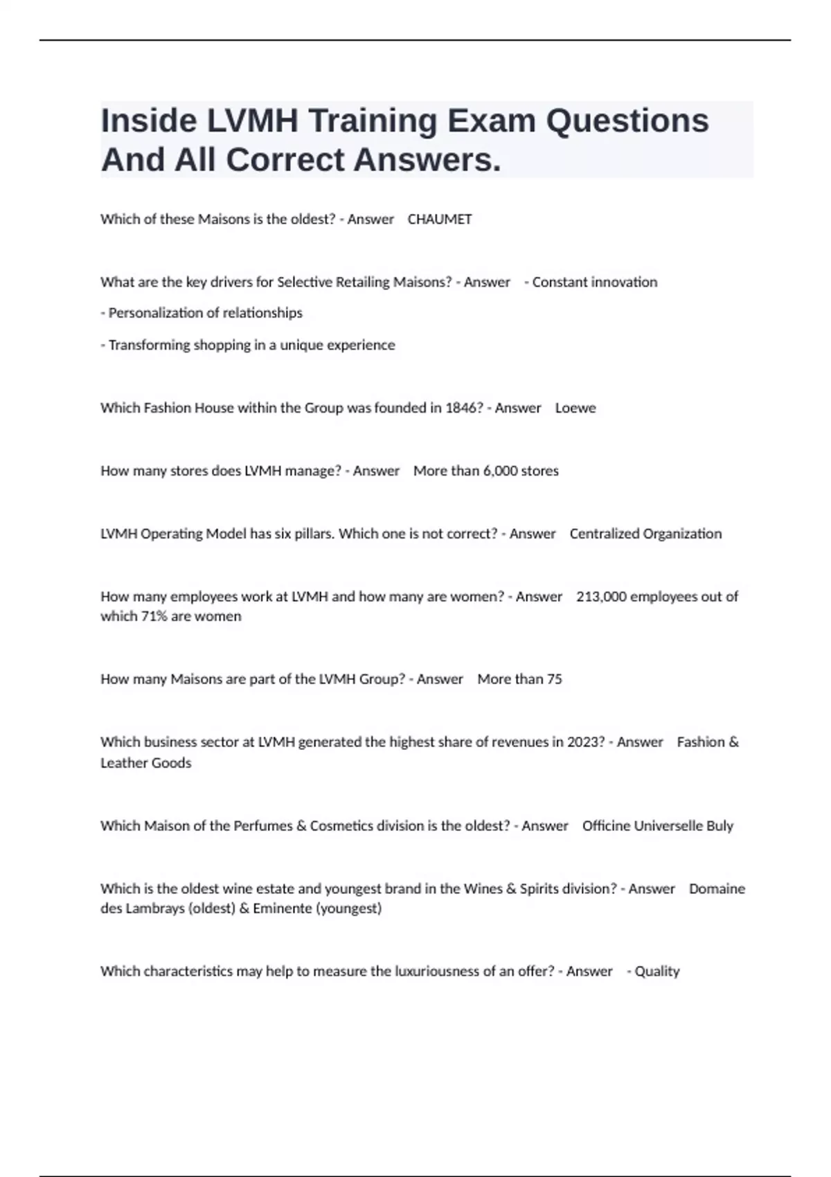 1 Exam (elaborations) LVMH Training Exam Questions And All Correct Answers. 2 Exam (elaborations) Inside LVMH Prep Exam Questions And All Correct Answers. 3 Exam (elaborations) Inside LVMH Final Quiz And All Complete Verified Solutions. 4 Exam (elaborations) Module 2 Practice Exam Questions With Guaranteed Pass Solutions. 5 Exam (elaborations)