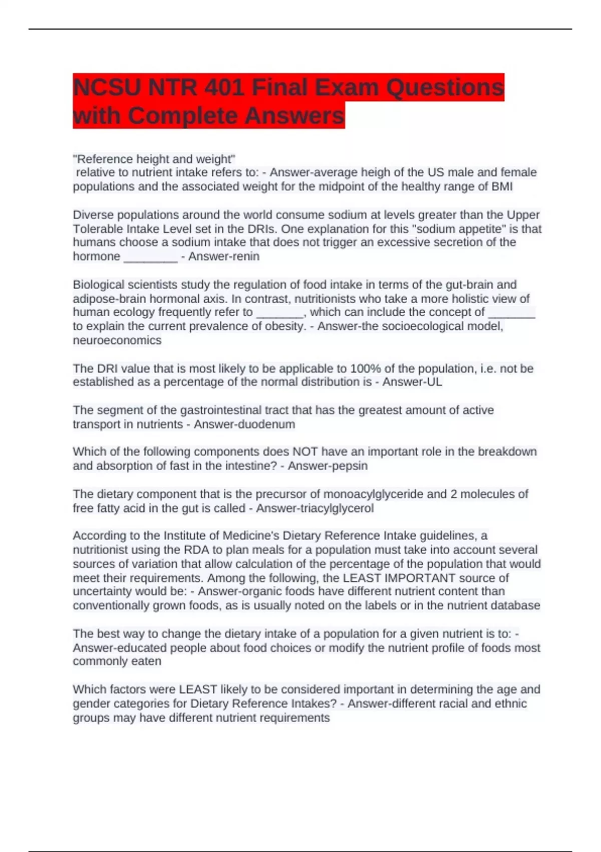 NCSU NTR 401 Final Exam Questions with Complete Answers
